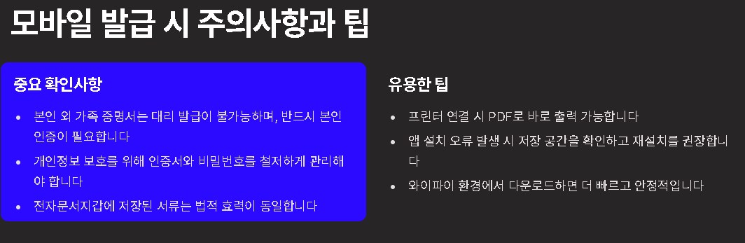 - 전자문서지갑 미설정 시 휴대폰 발급 단계에서 막히므로, 먼저 정부24 앱에서 전자문서지갑부터 만드는 것이 좋습니다.