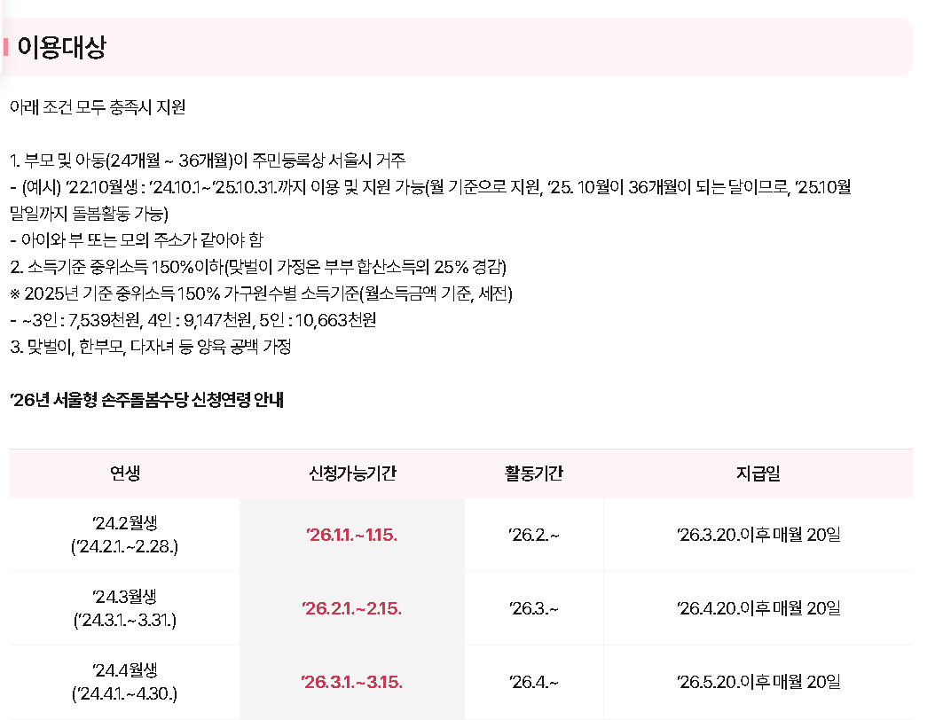 아래 조건 모두 충족시 지원 1. 부모 및 아동(24개월 ~ 36개월)이 주민등록상 서울시 거주 - (예시) ’22.10월생 : ’24.10.1~’25.10.31.까지 이용 및 지원 가능(월 기준으로 지원, ‘25. 10월이 36개월이 되