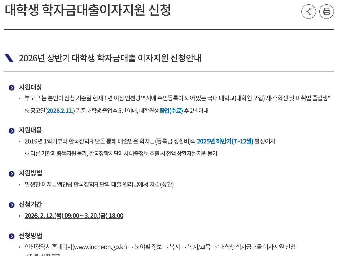2026년 기준 인천시 학자금 이자 지원 대상은 다음과 같습니다. 우선 신청일 기준 인천시에 주민등록이 되어 있어야 합니다. 그리고 한국장학재단을 통해 학자금 대출을 받은 대학생, 대학원생이거나,