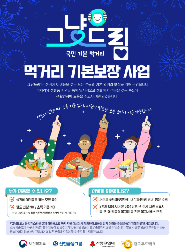 생계위기 때 바로 받는 먹거리 지원, 먹거리 기본보장 코너(그냥드림/Just Dream)한눈에 정리갑자기 실직·질병·가계 사정으로 오늘 먹을 것부터 막막해지는 경우가 있습니다. 이런 상황에서 별도