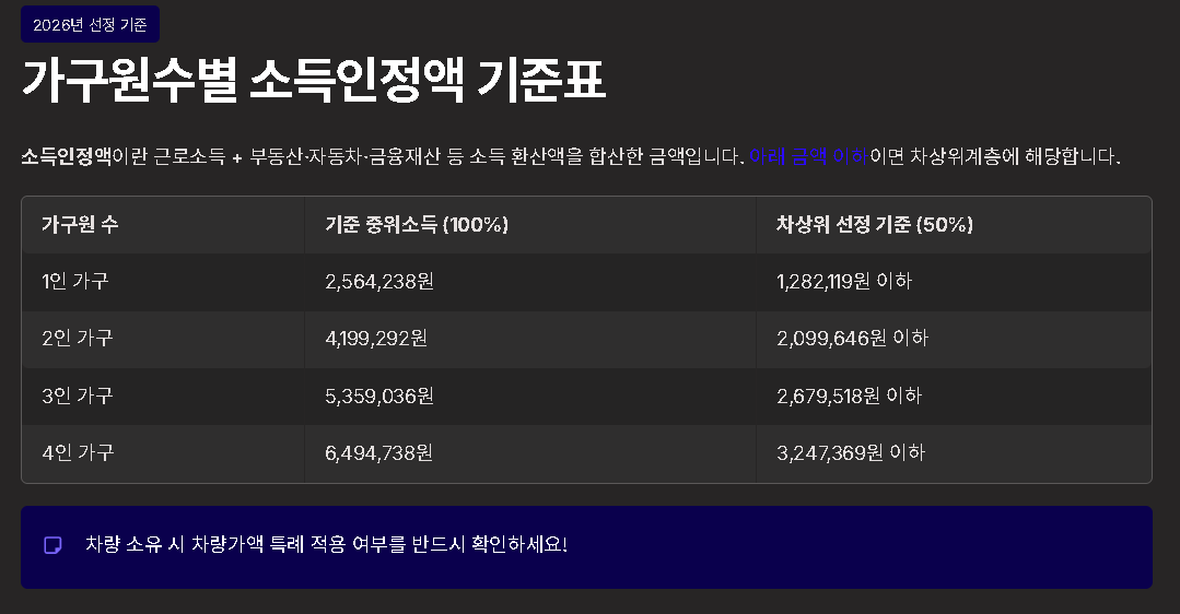 2026년 차상위계층 소득 기준 (중위소득 50%)