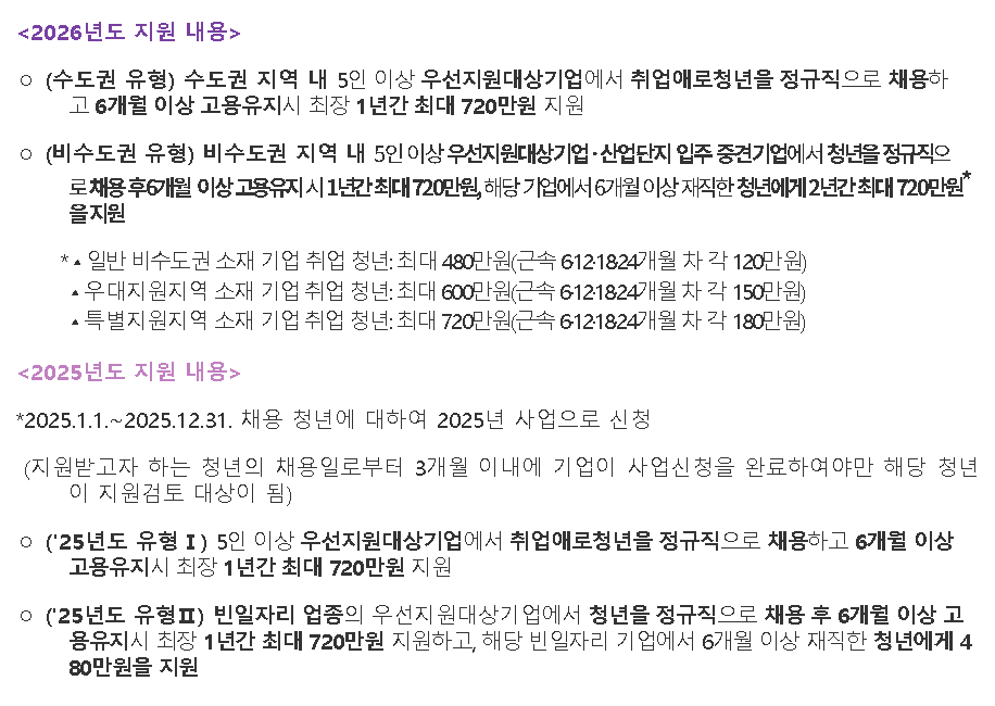 기존에는 Ⅰ·Ⅱ유형처럼 나뉘어 이해가 어려웠는데, 2026년부터는 수도권 유형 / 비수도권 유형으로 단순화됩니다. 핵심은 수도권 쏠림을 완화하기 위해 비수도권 취업·근속을 더 강하게 인센티브로 밀어준다는 점입니다.