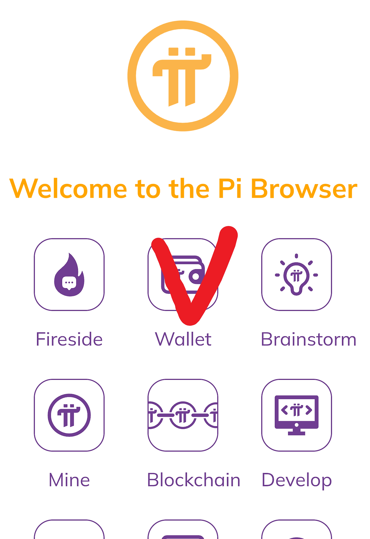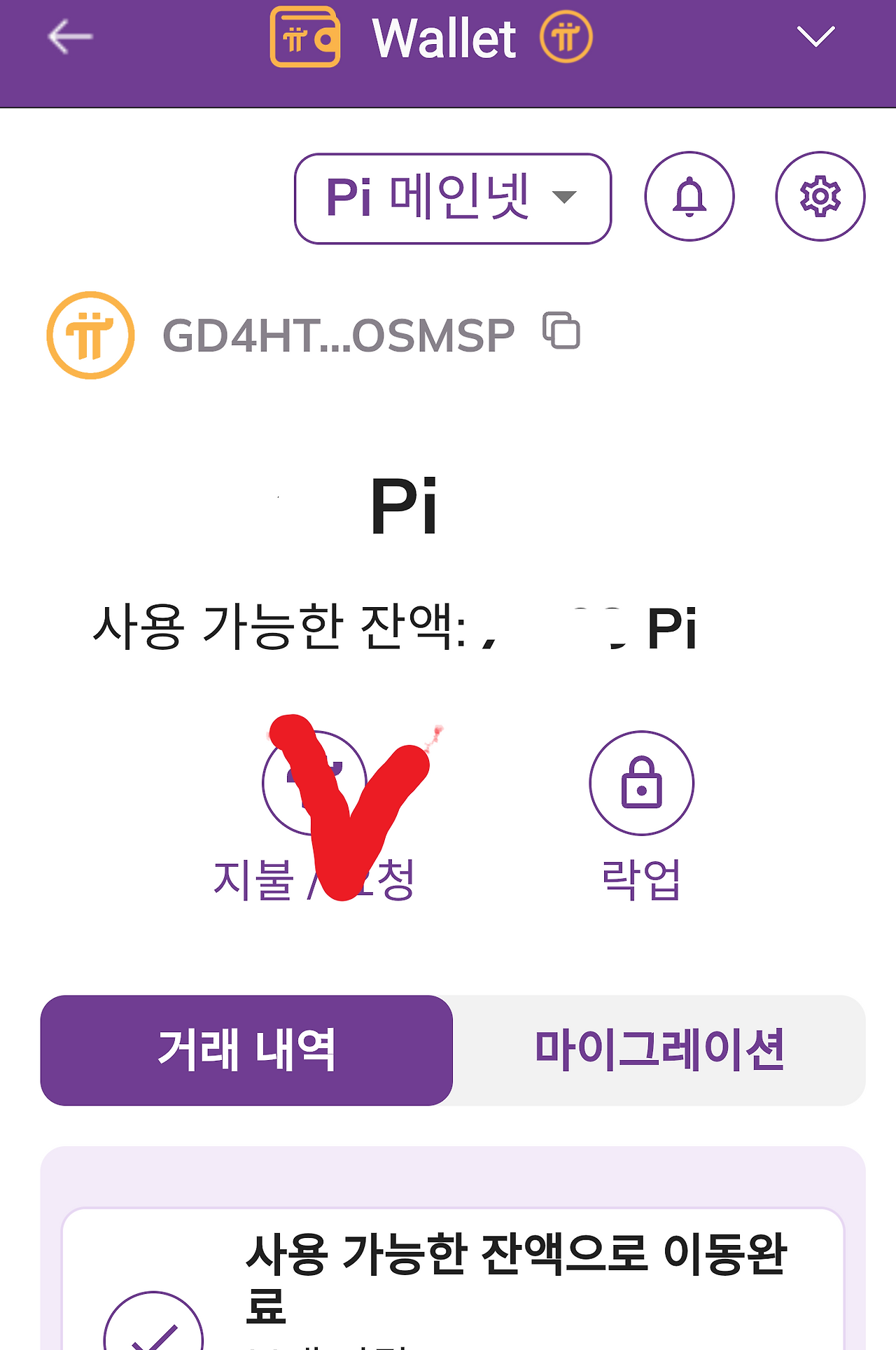 메인넷 지갑(Pi Wallet) 접속: 앱 내 "Mainnet" 섹션에서 빨간색 표시 "지갑"(Wallet)을 선택합니다.
