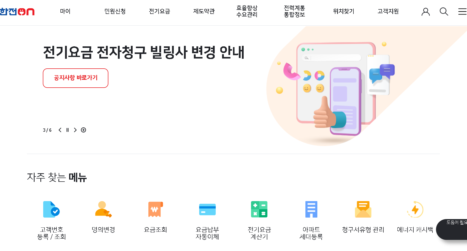 로그인 후 전기요금조회 메뉴로 이동하면 최근 고지내역과 납부상태를 볼 수 있어요.