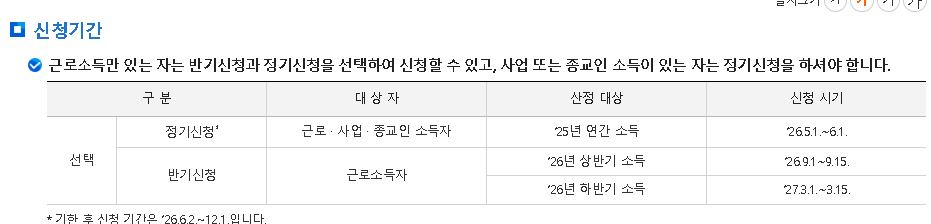 상반기 신청은 1월 1일부터 6월 30일까지의 근로소득을 기준으로, 하반기 신청은 7월 1일부터 12월 31일까지의 소득을 기준으로 지급됩니다.