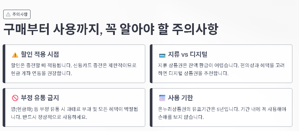 디지털 먼저, 지류는 서둘러: 모바일·카드형은 10% 상시 할인에 실적·포인트까지, 지류는 재고 소진·은행 방문 번거로움 감안. 사용처·가맹점 미리 확인: 동네 시장·마트·정육점·반찬가게 등 어디까지 되는지 검색 후 장보기 리스트를 맞춰 두면 할인 효과 극대화.