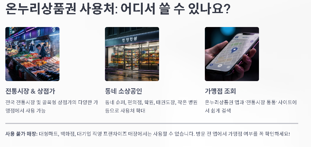 온누리상품권은 전통시장과 상점가, 상권 활성화 구역 등 다양한 가맹점에서 사용 가능합니다. 서울·광역시 기준으로 유명 재래시장부터 동네시장, 일부 프랜차이즈·소상공인 매장까지 사용처가 확대되어 있어, “시장 갈 때만 쓰는 돈”이 아니라 생활비 전반을 줄이는 수단으로 활용할 수 있습니다. 사용처는 온누리상품권 홈페이지 또는 앱 내 ‘가맹점 찾기’ 메뉴에서 지역·업종별로 검색할 수 있어, 장보기 전 미리 확인해 두면 동선을 짜는 데 도움이 됩니다.