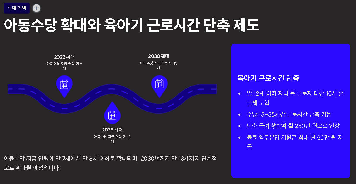 | 영유아 지원 | 영아수당 및 아동수당 확대(연령/금액 개선) |