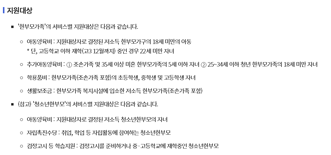 | 추가 아동양육비 | 청년한부모(25~34)·조손·미혼 등 유형/연령별 추가지원 (예: 5세 이하 추가 10만 원 등) |