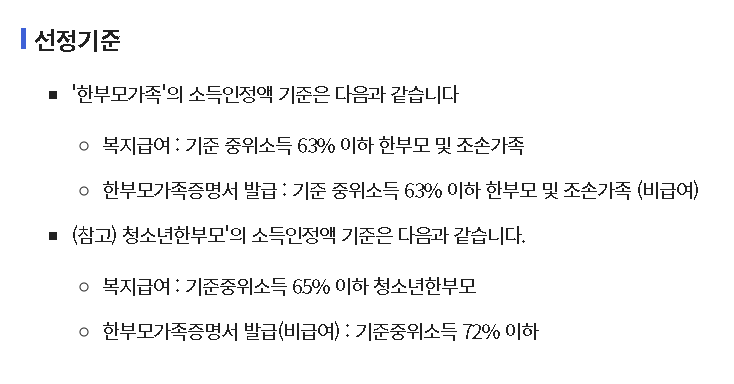 지원대상 소득기준 확대: 한부모가족 복지급여 기준이 기준 중위소득 65% 이하로 확대됩니다.