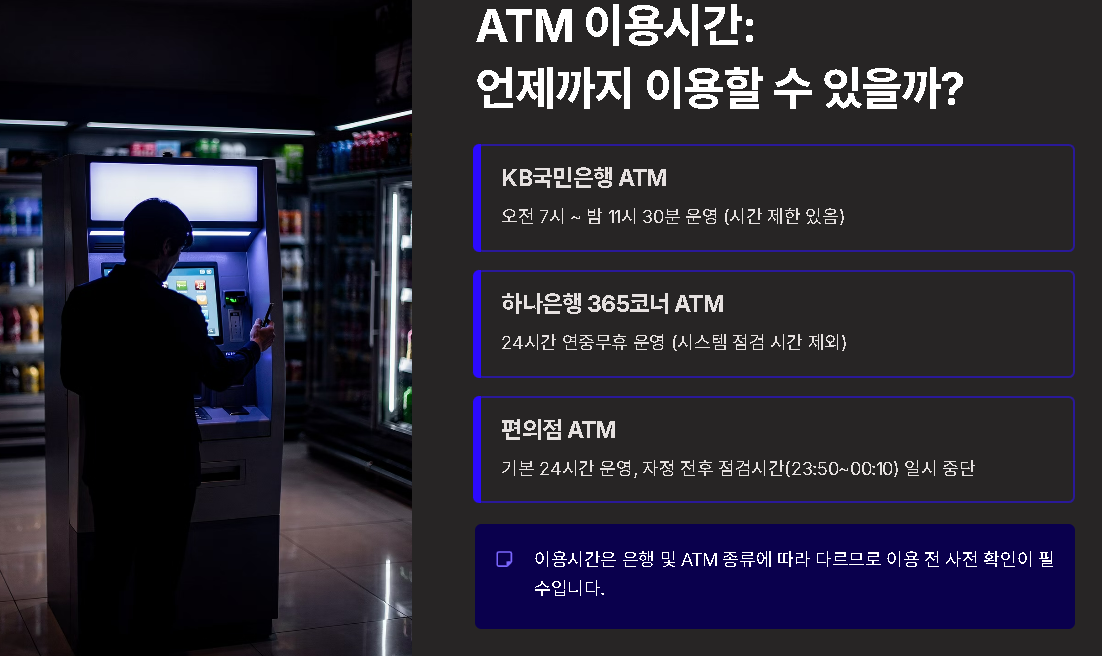 ATM은 설치 위치와 유형에 따라 이용 가능 시간이 달라요.